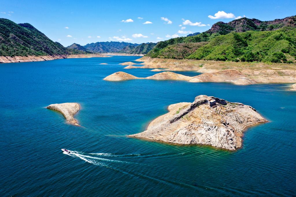 2012年8月13日,在河北寬城滿族自治縣潘家口水庫“水下長城”景區,一船隻從城墻邊駛過。
