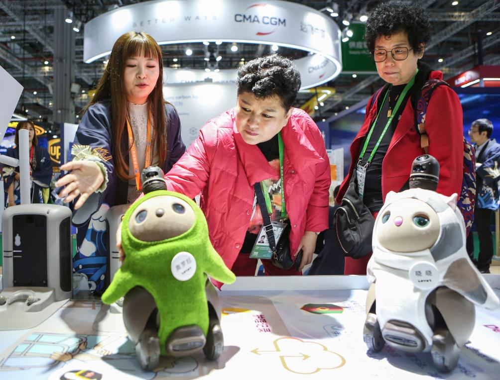 11月9日,參觀者在第七屆進博會上與家庭陪伴機器人互動。新華社記者 王乙傑 攝