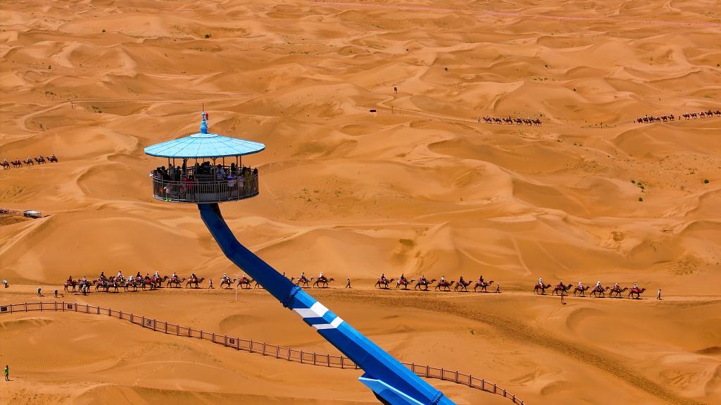 7月5日,游客在中衛市沙坡頭旅游景區體驗大漠飛天項目和騎駱駝(無人機照片)。新華社記者 馮開華 攝