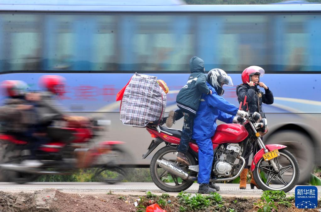 2017年1月19日,在廣東佛山務工的廣西籍務工人員陳一鋒、徐麗寧夫婦(前)騎行在回家過年的路上。 新華社記者 王建華 攝