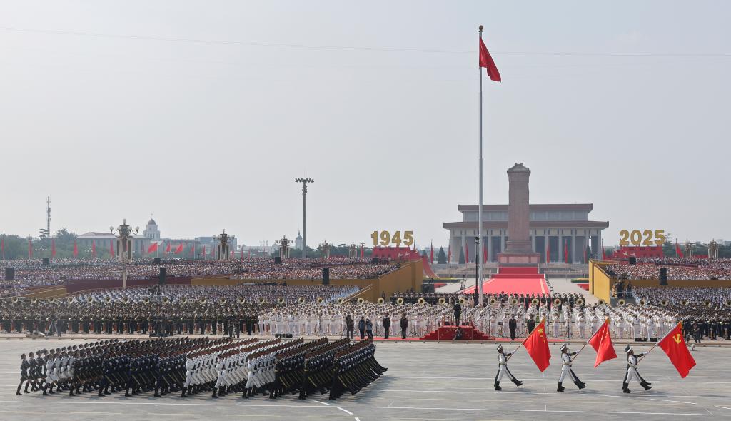 9月3日,紀念中國人民抗日戰爭暨世界反法西斯戰爭勝利80周年大會在北京隆重舉行。這是國旗護衛隊在行進中。新華社記者 費茂華 攝