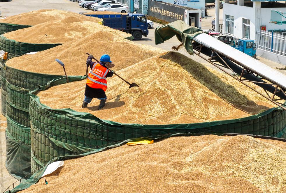 位於江蘇盱眙的江蘇農墾三河農場收穫的小麥進入大華種業三河分公司存儲(5月28日攝,無人機照片)。新華社發(許昌銀攝)