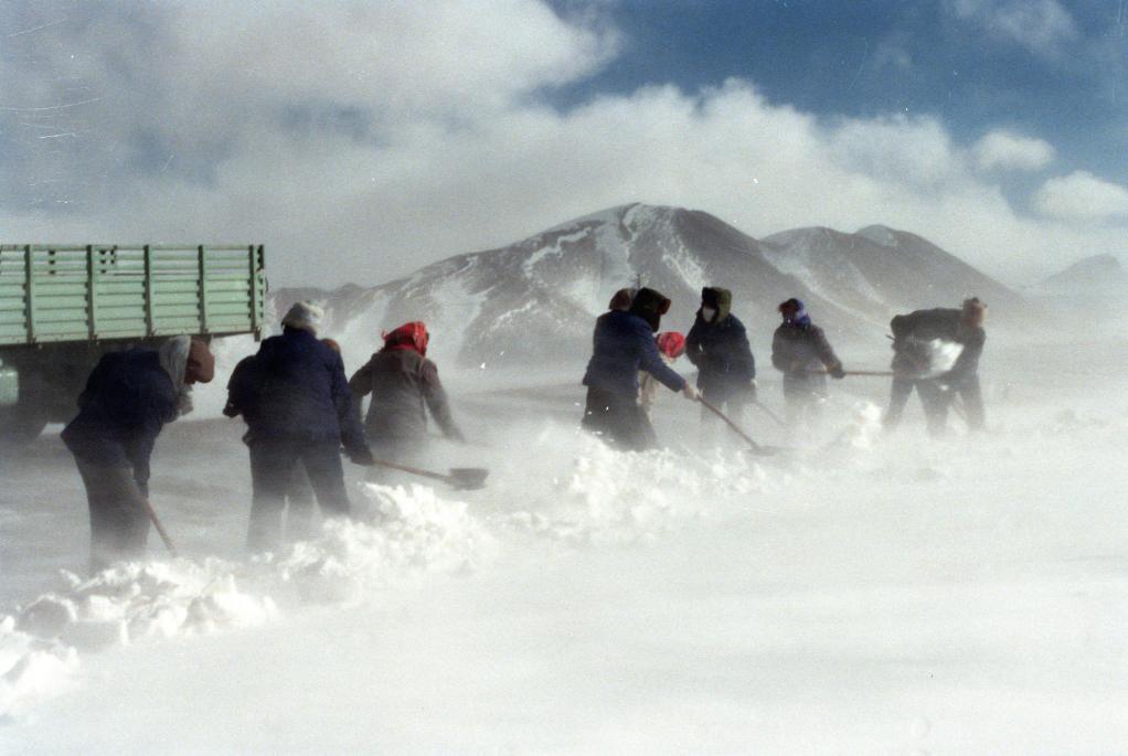 由19名藏族青年組成的109道班養路工在清除青藏公路上的積雪。(1992年10月26日發)
