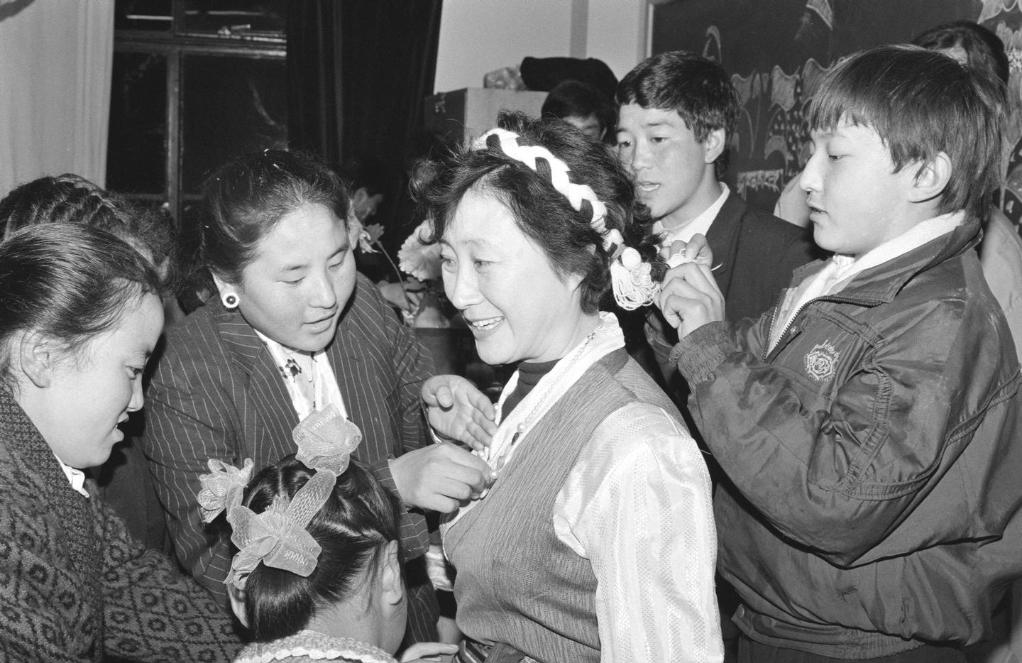 北京市西藏中學600多名高原兒女歡度藏曆水猴年新春佳節。預科二班的藏族中學生給他們的“張媽媽”——班主任張榮安老師穿上藏裝,共慶這歡樂時刻(1992年3月5日攝)。