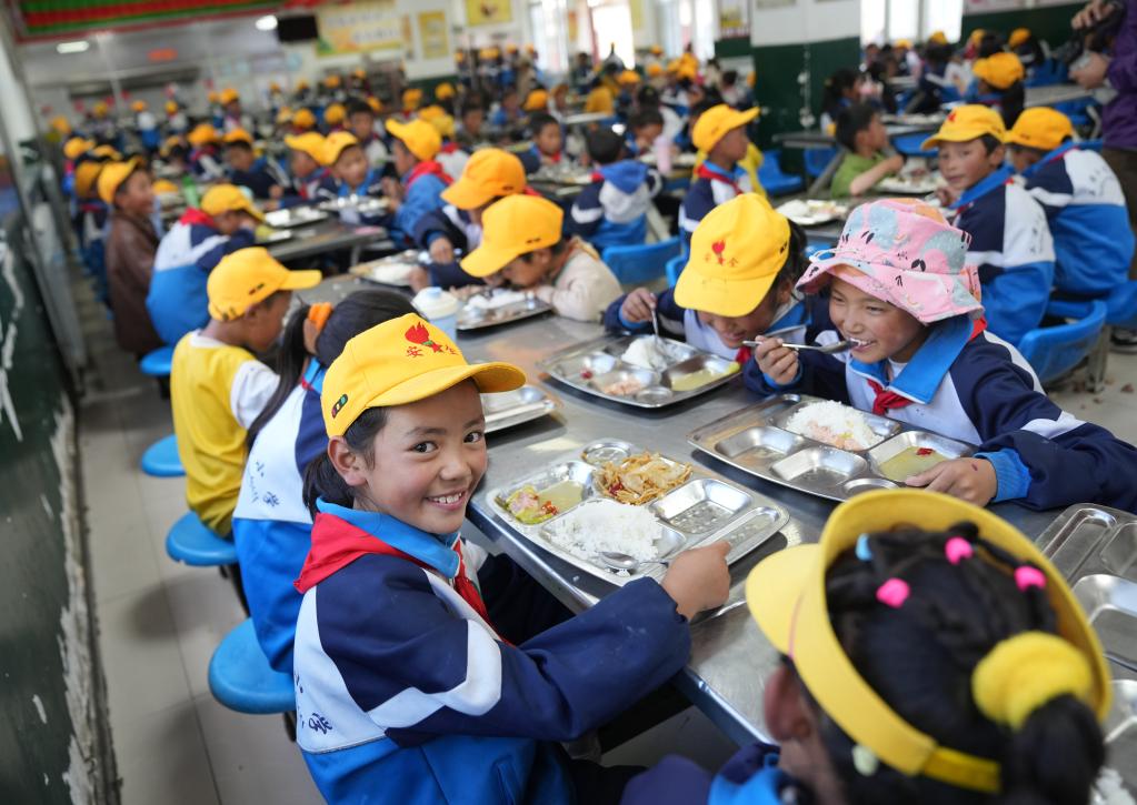 西藏林芝市工布江達縣娘蒲鄉中心小學學生在食堂用餐(2024年9月3日攝)。 新華社記者 晉美多吉 攝