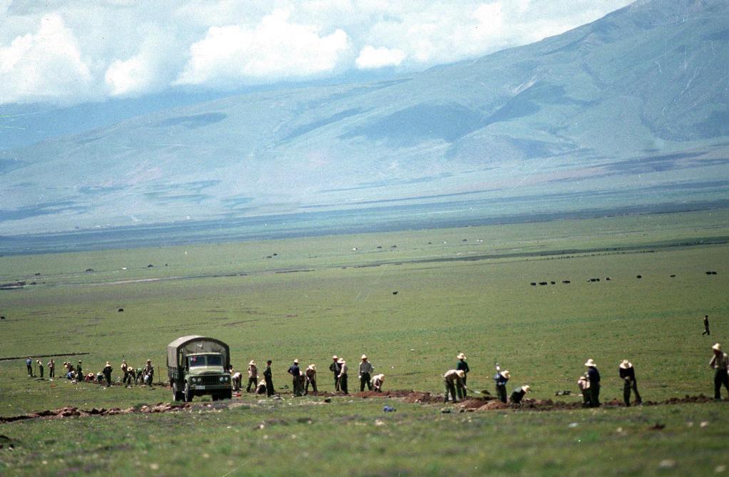 蘭州——西寧——拉薩光纜工程,從1997年7月開始施工。這是工人和駐藏部隊官兵在海拔4000多米的藏北草原上準備鋪設光纜的情景。(1997年9月18日發)