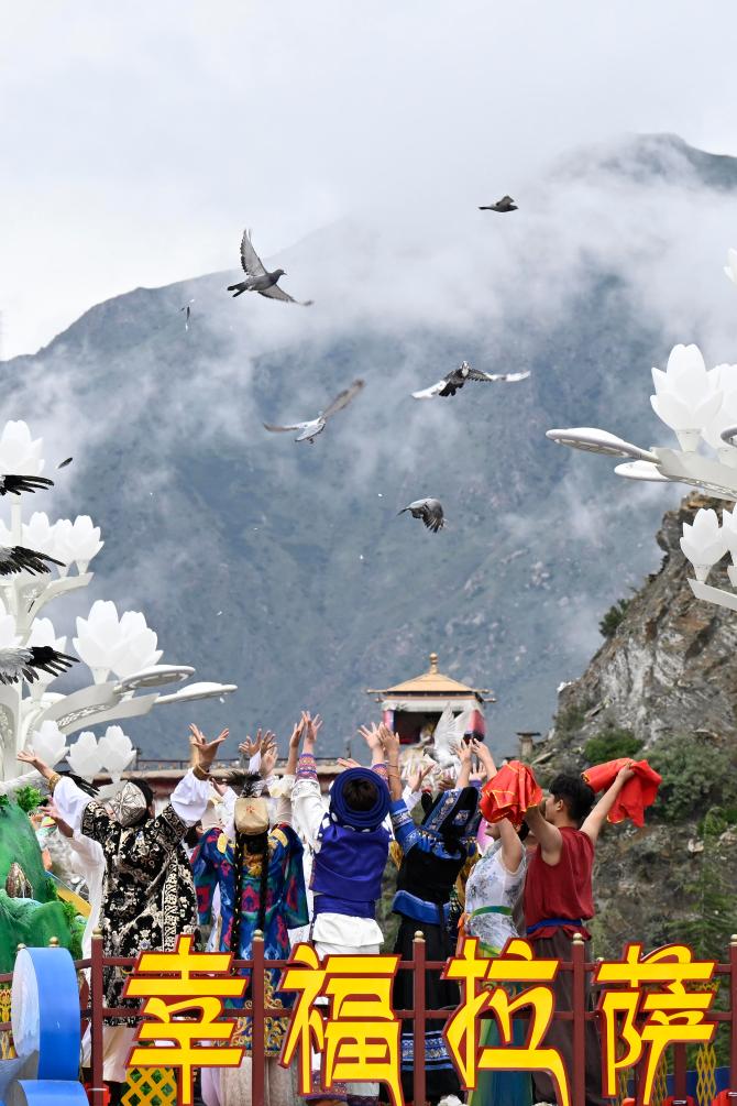 2025年8月21日上午,西藏各族各界幹部群眾約2萬人歡聚拉薩市布達拉宮廣場,熱烈慶祝西藏自治區成立60周年。這是彩車上的演員通過布達拉宮廣場時放飛鴿子。新華社記者 申宏 攝