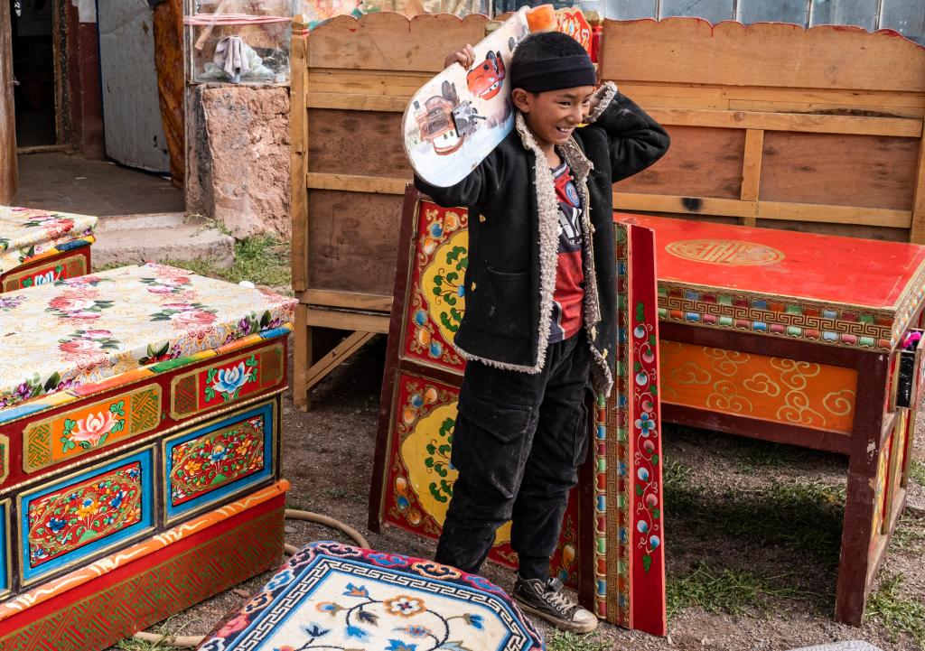 雙湖縣多瑪鄉仲魯瑪村的一個小朋友拿着自己心愛的滑板,準備搬去新家(2022年7月13日攝)。新華社記者 孫非 攝