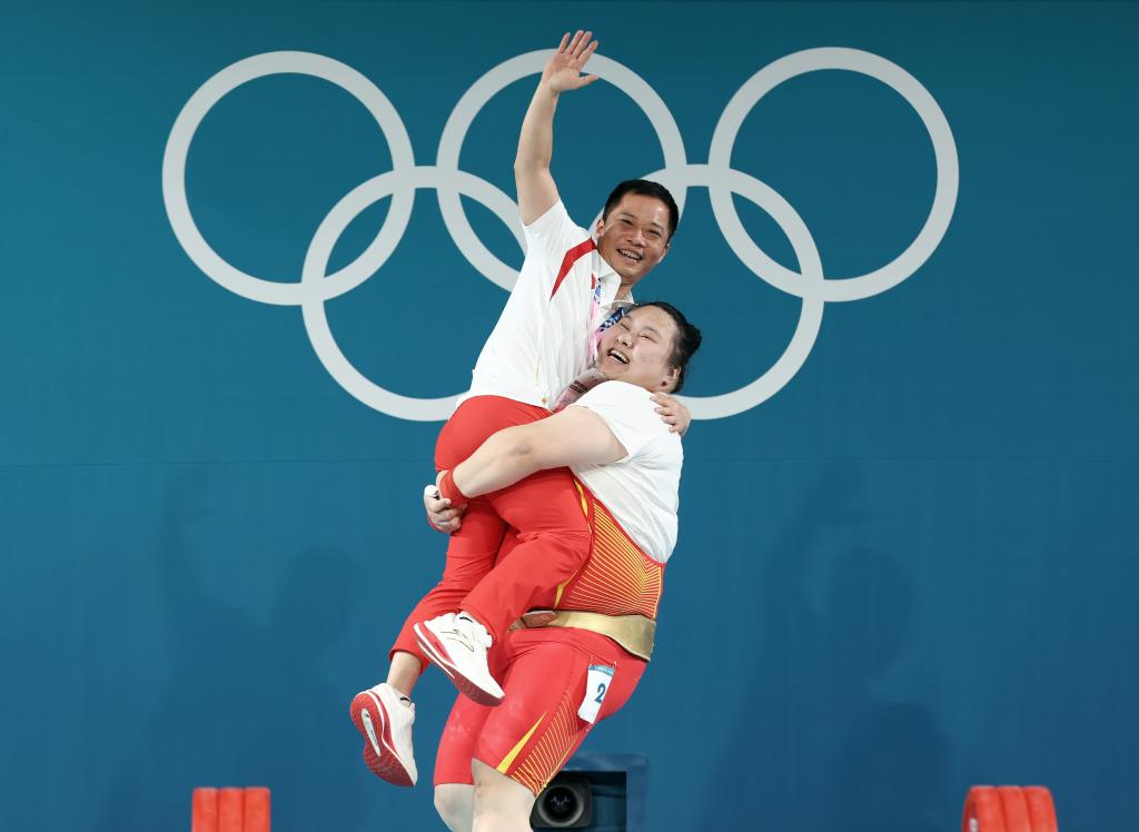 ↑2024年8月11日,李雯雯(下)在巴黎奧運會舉重女子81公斤以上級比賽後抱起教練吳美錦慶祝奪冠。新華社記者楊磊攝