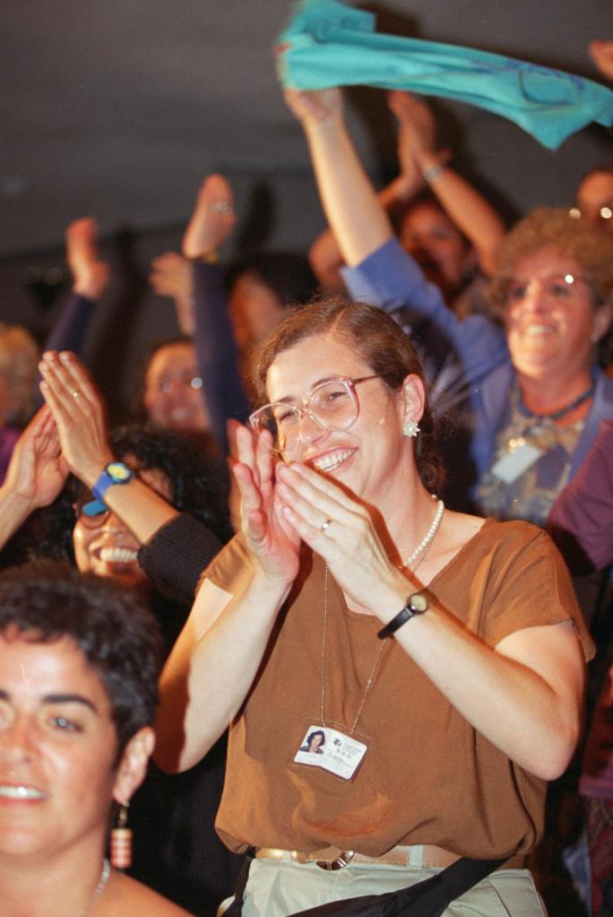 1995年9月13日,在國際會議中心主會場舉行的討論會上,與會人士為有關婦女經濟平等問題的發言熱烈鼓掌。