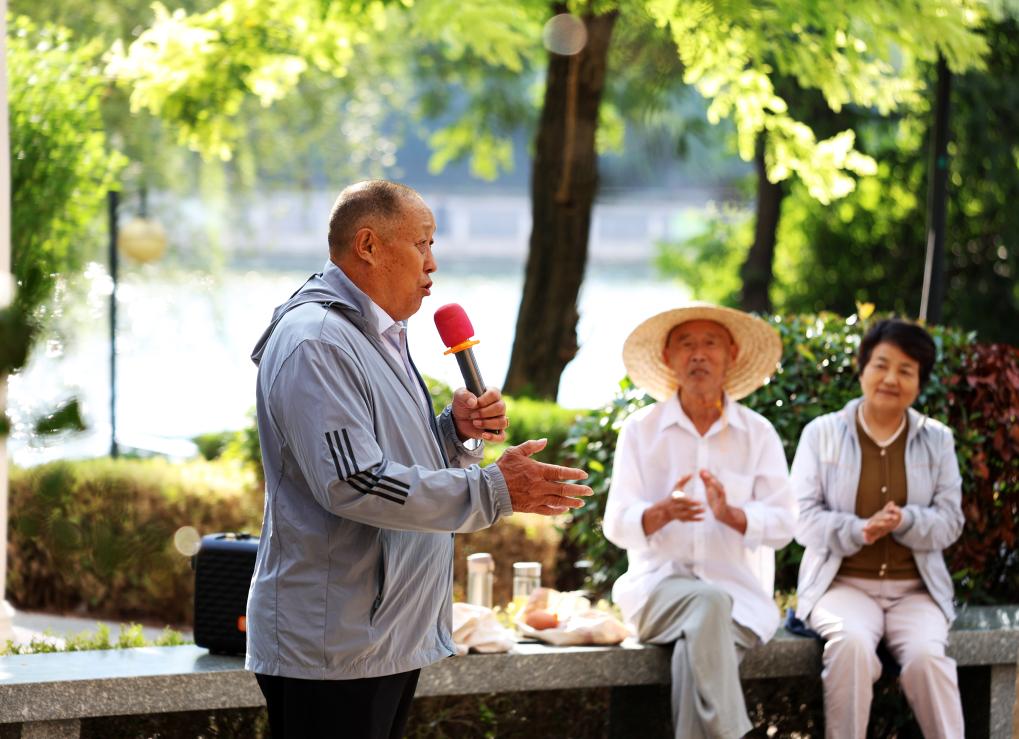 在山東省滕州市一處公園,市民正在演唱京劇。