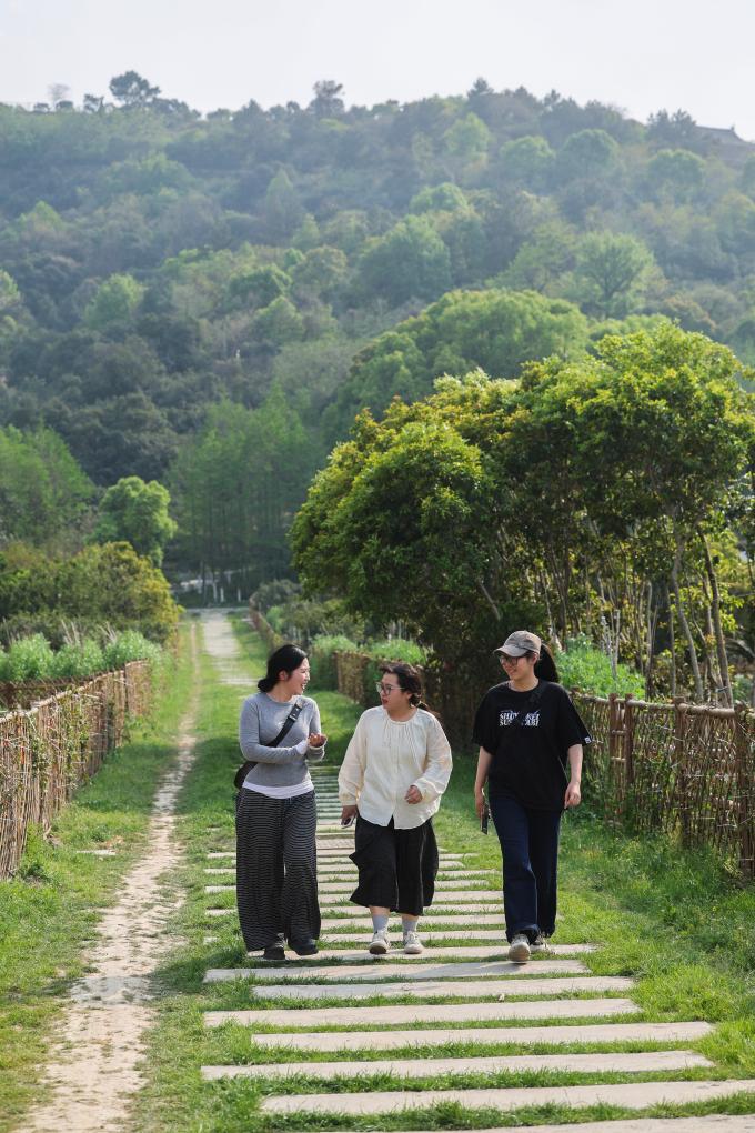 游客在浙江省慈溪市滸山街道施山社區施家山公共文化空間的口袋公園內散步。