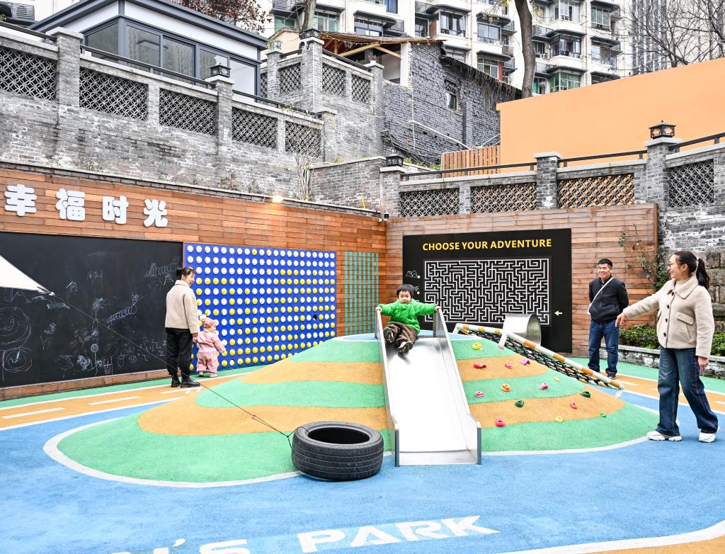 居民和小朋友在重慶市江北區大石壩街道忠恕沱社區的一口袋公園休閒、玩耍。