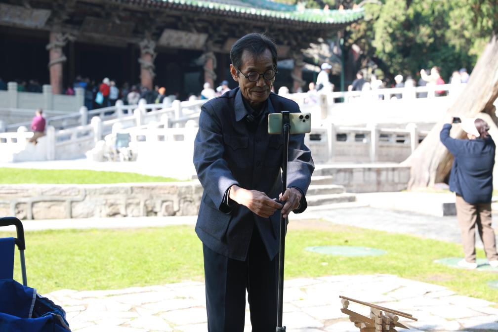 新華社太原10月29日電(記者張哲)午後的陽光穿過太原晉祠博物館的古槐枝葉,在聖母殿前灑下斑駁光影。75歲的王永先拎着裝滿鬥拱模型和手繪圖的工具箱,拉着小推車慢慢走近。他熟練地撐開手機支架,調整好角度,從箱子裏取出一個1/15比例的聖母殿鬥拱模型,對着鏡頭輕輕頷首:“大家好,我是古建築鬥拱學堂的王老師,今天咱們聊聊這座宋代古建築。”
