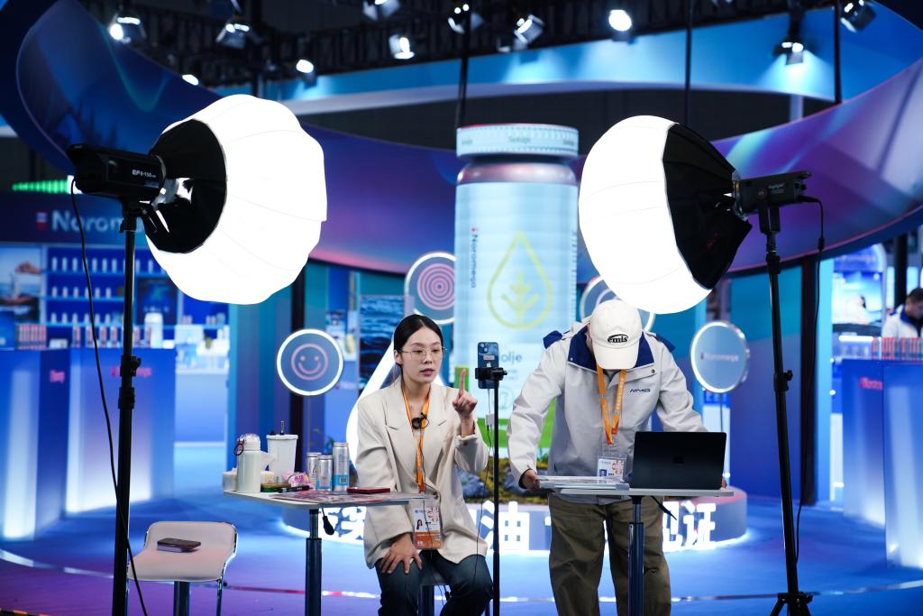 11月4日,工作人員在第八屆進博會醫療器械及醫藥保健展區直播。新華社記者樊雨晴 攝