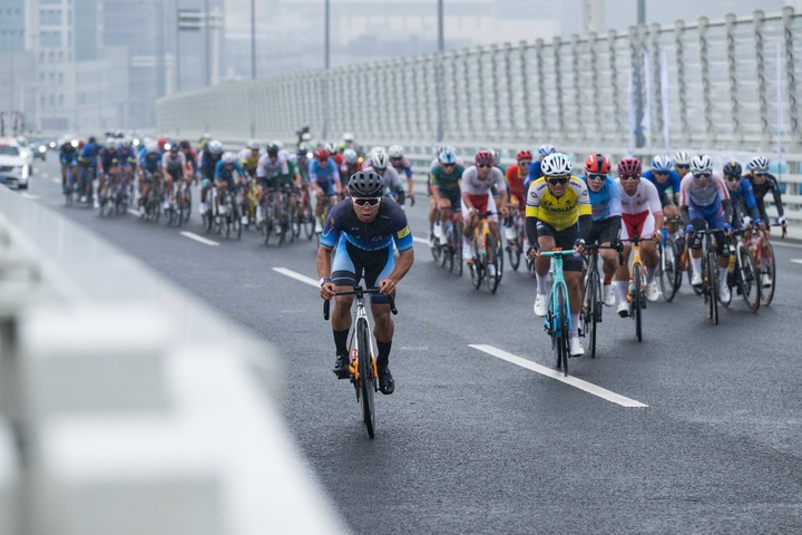 2024年11月24日,2024粵港澳公路自行車賽暨第十五屆全國運動會公路自行車測試賽舉行,圖為參賽選手在澳門大橋騎行。新華社發(張金加攝)