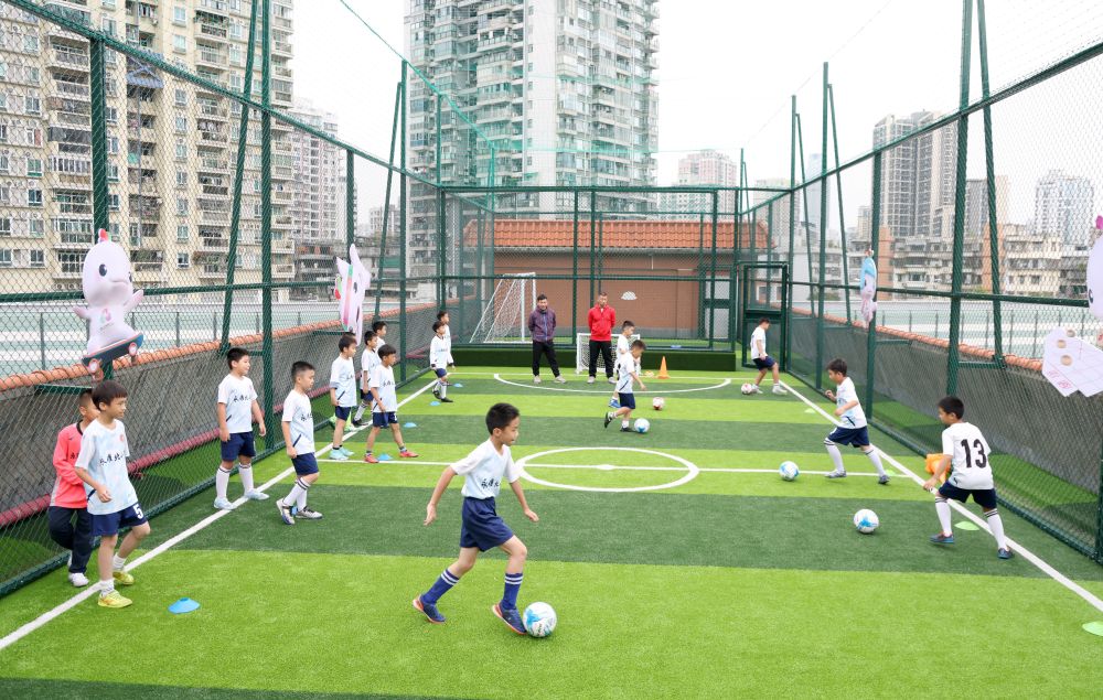 11月3日,廣州市永曜北小學的學生在學校樓頂天&的足球場踢球。近年來,廣州市越秀區通過盤活橋下空間、屋頂&&及街旁閒置地等城市的"金角銀邊",拓展老城區運動空間,激發全民健身活力。新華社記者 盧漢欣 攝