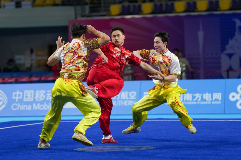 11月10日,重慶隊選手顏亮、周先清、馬魯豫在團體賽男子三人徒手對練比賽中。最終,重慶隊獲得總分第四名。新華社記者 晉美多吉 攝