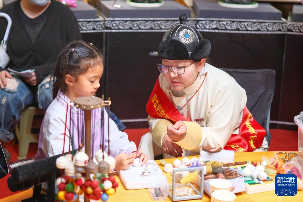 2025年7月19日,在錫林郭勒那達慕風情園,小朋友在那達慕現場體驗蒙古族傳統毛氈製作。新華社記者 馬金瑞 攝