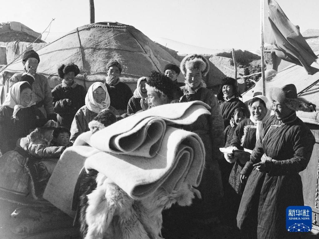 1963年,內蒙古自治區錫林郭勒盟西烏珠穆沁旗,社員旺吉勒從隊裏領取了新的蒙古包氈子和皮革。新華社記者 寶音朝克圖 攝