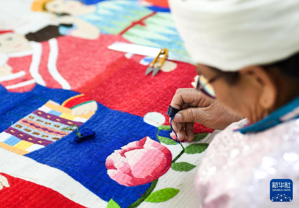 2024年5月17日,氈繡技藝傳承人在內蒙古錫林郭勒盟蘇尼特左旗非遺保護中心製作氈繡作品。新華社記者 李志鵬 攝