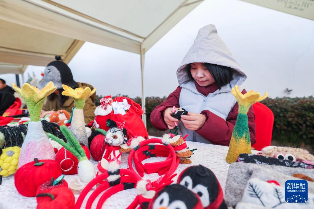 2024年12月21日,在浙江省杭州市臨平區塘棲鎮舉辦的共富年貨節上,共富工坊工作人員在製作羊毛氈作品。新華社記者 徐昱 攝