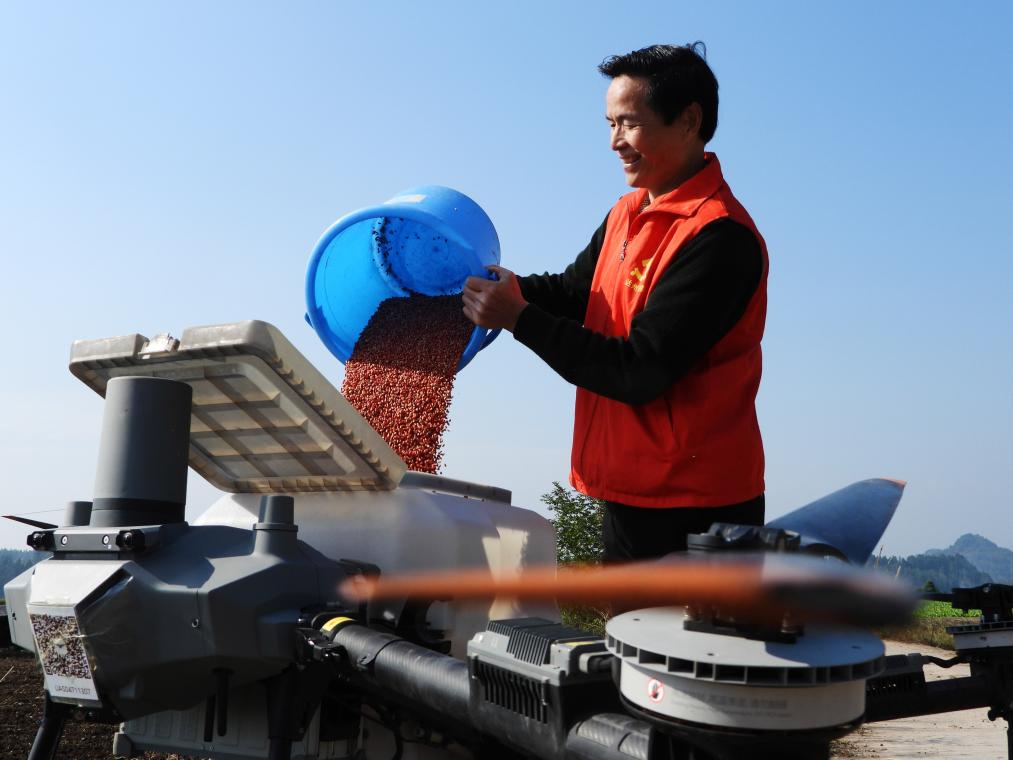 11月21日,農機手在四川省達州市渠縣文崇鎮譚壩社區田間給植保無人機添加小麥種子,準備進行“飛播”作業。(鄧良奎 攝)