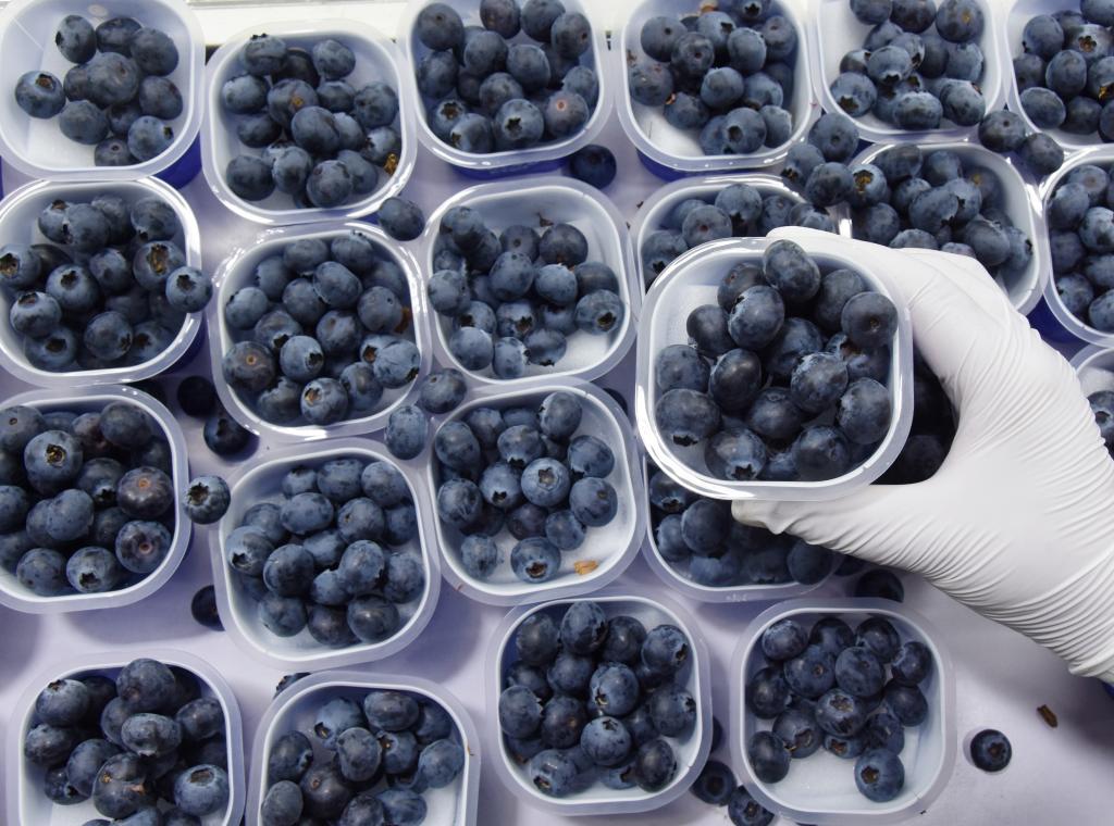 農戶在雲南省蒙自市草壩鎮繽紛農業示範基地的冷藏庫裏分揀藍莓。新華社發(薛瑩瑩 攝)