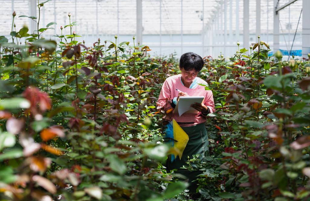 工作人員在麗江現代花卉産業園內記錄鮮花生長狀況。新華社記者王冠森 攝