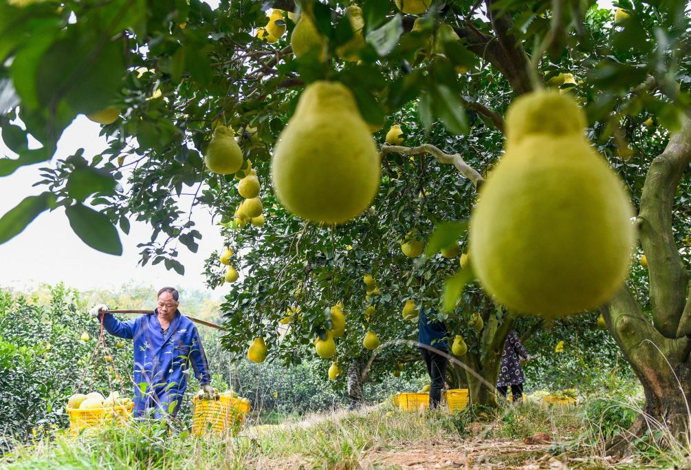 12月6日,在湖南省永州市道縣梅花鎮赤源村三和希望農場,農民在收穫柚子。大雪節氣到來之際,各地農民搶抓農時開展農業生産。新華社發(蔣克青攝)
