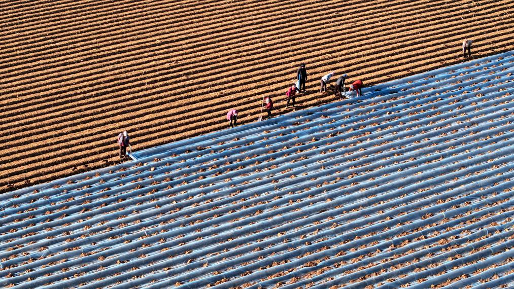 12月6日,在山東省臨沂市平邑縣臨澗鎮,農民為蔬菜幼苗覆蓋保溫薄膜(無人機照片)。大雪節氣到來之際,各地農民搶抓農時開展農業生産。新華社發(武紀全攝)