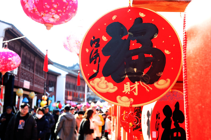 2025年1月29日,農曆正月初一,江蘇蘇州桃花塢唐寅故居文化區舉行“姑蘇年市·新春非遺游園會”活動,現場懸挂着福字等節慶裝飾品。新華社發(杭興微攝)