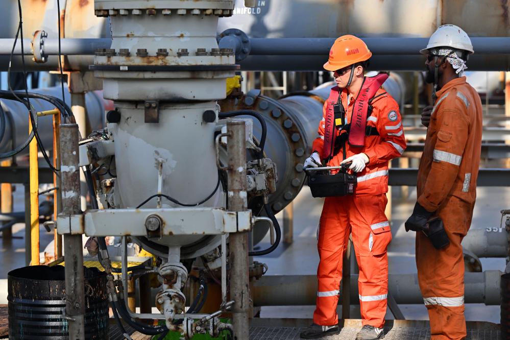 12月18日,裝載着石化原輔料的船舶抵達洋浦港後,國投洋浦油儲碼頭工作人員(左)和船舶外籍船員在進行卸油作業。新華社記者 郭程 攝