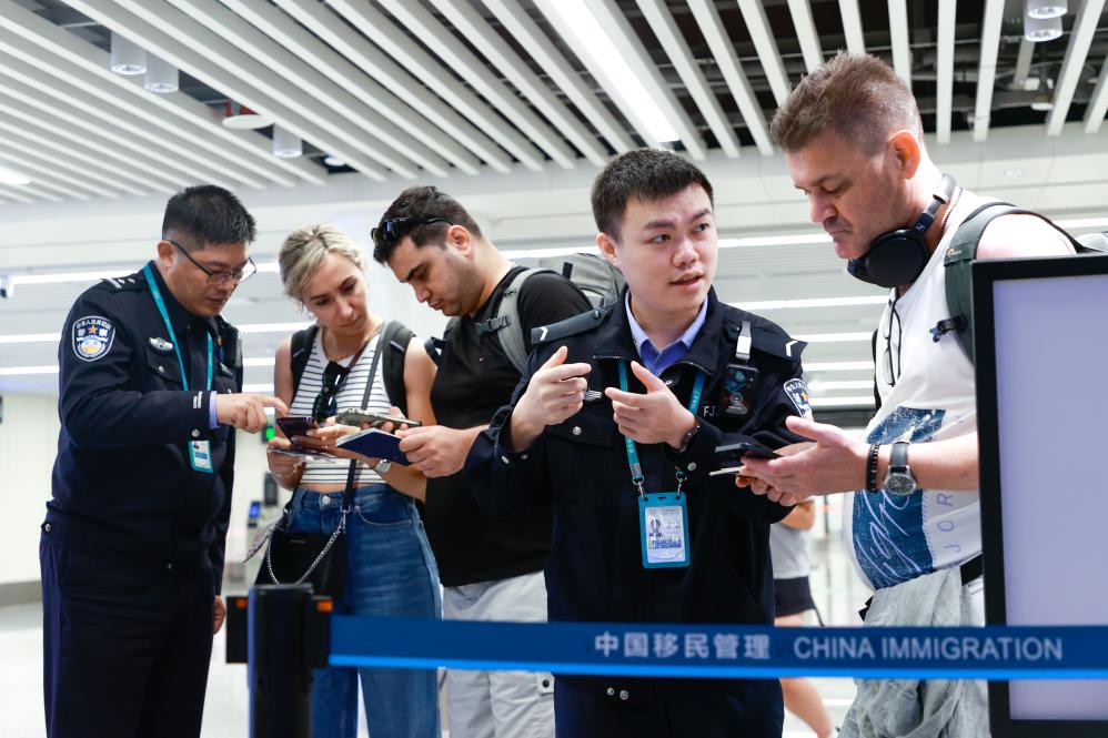 12月18日,海口美蘭邊檢站民輔警為入境旅客服務。新華社發 (孫浩戎 攝)