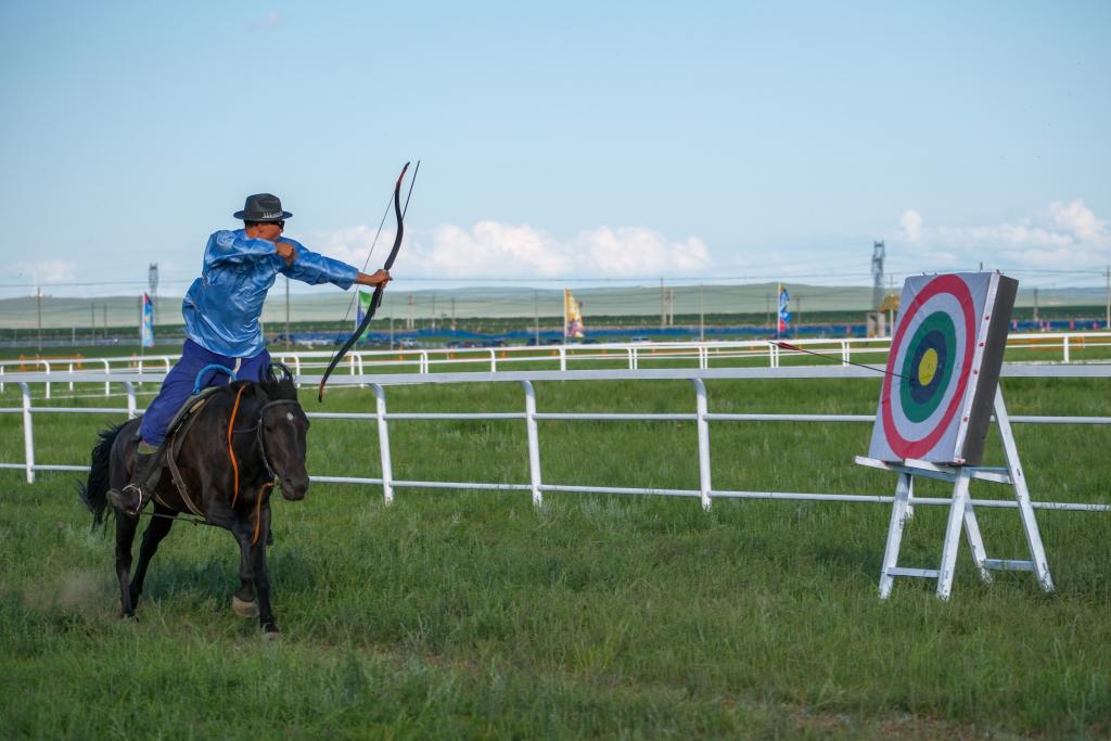 2025年7月20日,內蒙古自治區第35屆草原那達慕“男兒三藝”比賽在內蒙古錫林郭勒盟錫林浩特市舉行。“男兒三藝”包括賽馬、搏克和射箭,是每年那達慕上的固定比賽項目。新華社記者 馬金瑞 攝