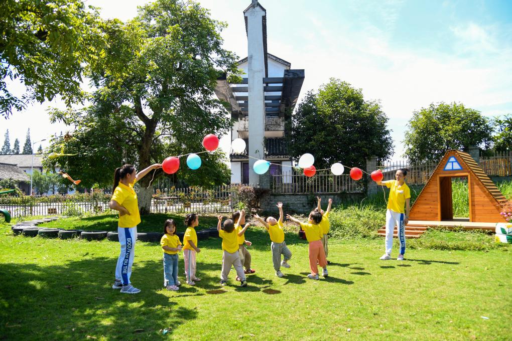 9月5日,四川瀘州白酒産業園區天驕托育園的老師帶領孩子們做游戲。新華社記者 江宏景 攝