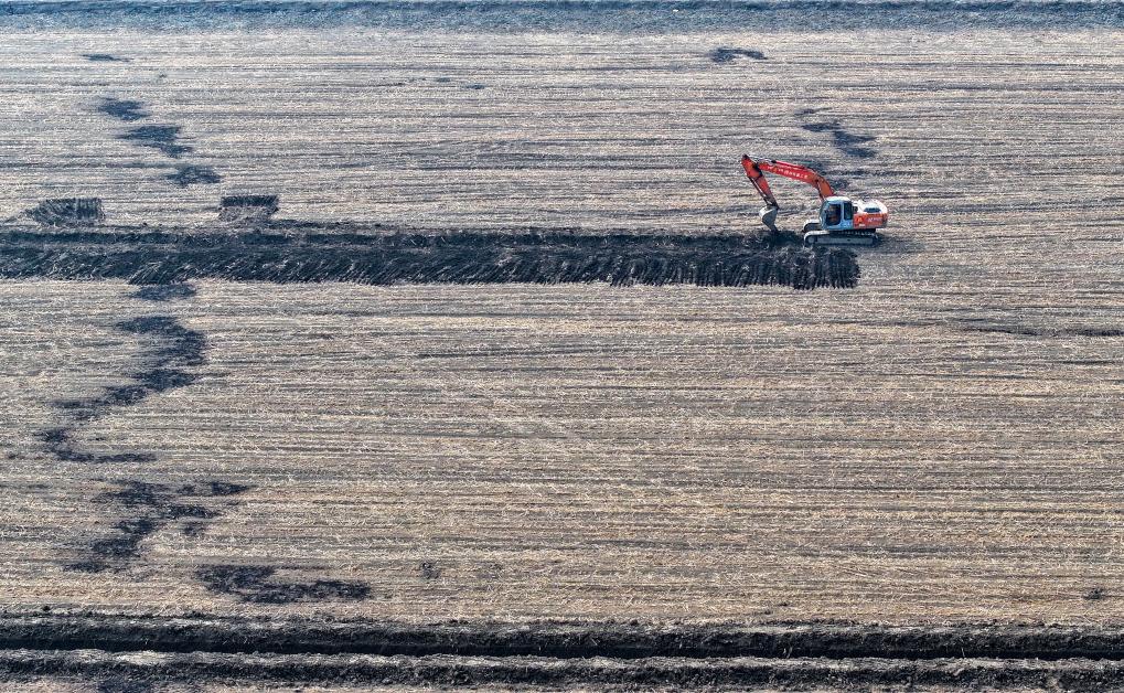 2025年3月11日,在天津市津南區八里&鎮大韓莊村,工人駕駛挖掘機進行高標準農田施工作業(無人機照片)。新華社記者趙子碩 攝