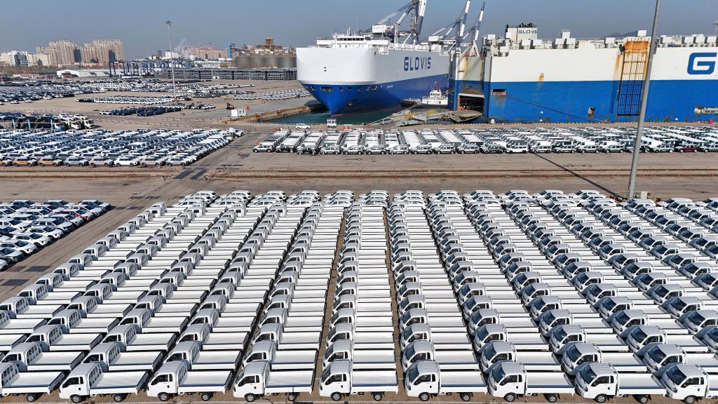 12月4日,汽車停在山東港口煙&港等待裝船(無人機照片)。新華社發(唐克攝)