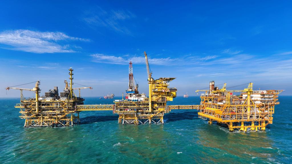 這是12月21日拍攝的渤海油田海上油氣平台作業現場(無人機照片)。12月21日,中國海油宣布,我國海上最大油田——渤海油田2025年累計生産油氣當量突破4000萬噸,創歷史新高,為國家能源安全和經濟社會高質量發展提供堅實保障。新華社發(杜鵬輝攝)