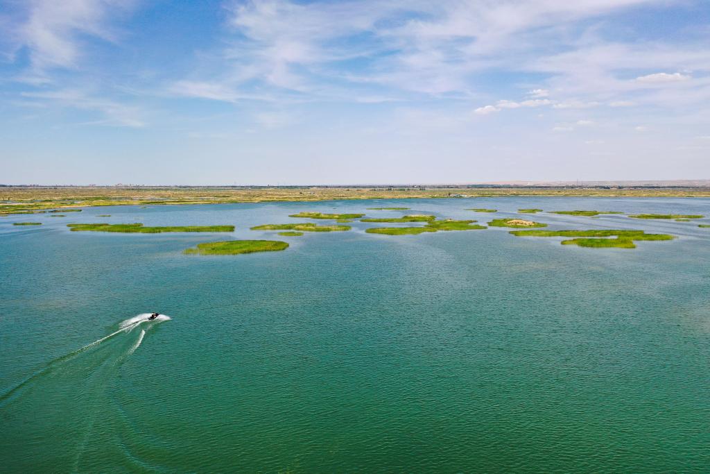 6月5日,在巴彥淖爾市磴口縣奈倫湖國家濕地公園,摩托艇行駛在湖面上(無人機照片)。黃河“幾字彎”逐漸展現“金沙藍海綠洲”的美麗畫卷。新華社記者 李志鵬 攝