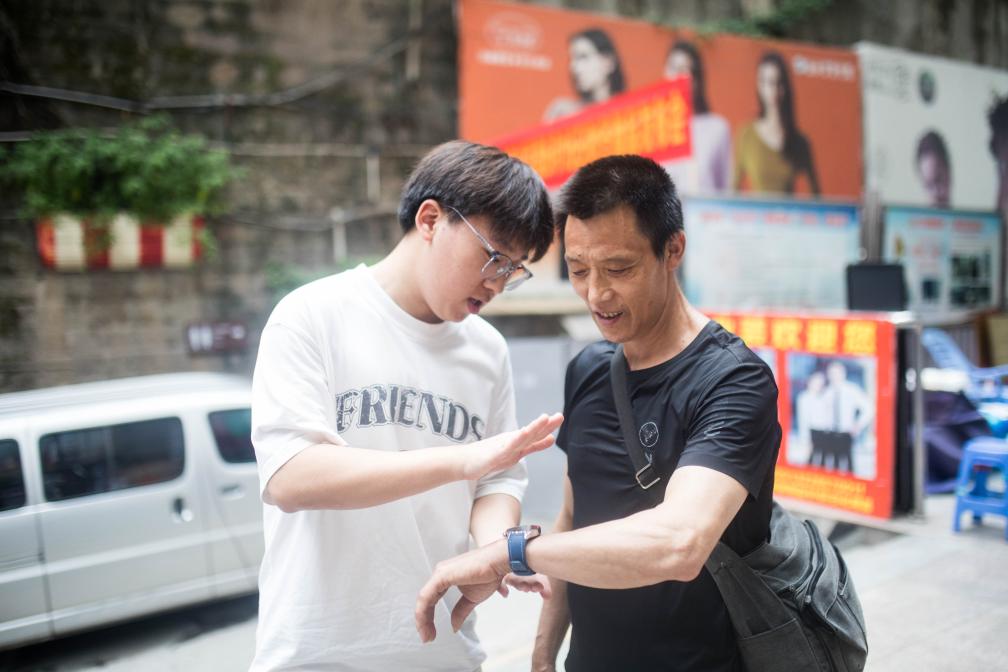 在重慶朝天門批發市場,冉光輝(右)戴上兒子冉俊超送的手錶(2025年6月14日攝)。新華社發(許康平攝)