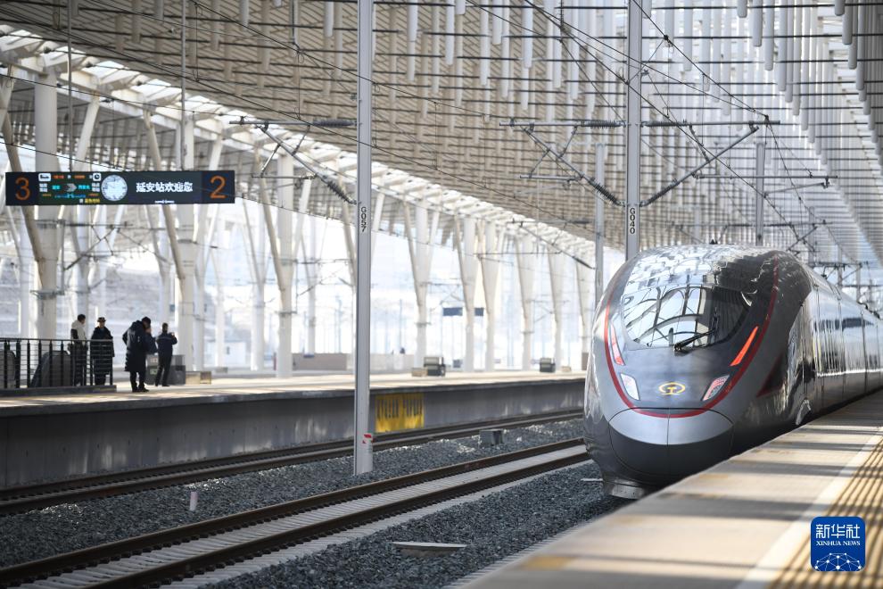 2025年12月26日,西延高鐵首發列車從延安站駛出。新華社發(劉一江 攝)