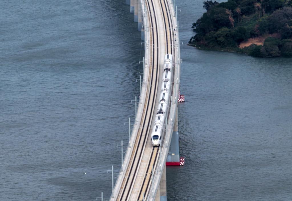 12月22日拍攝的行駛在汕頭濠江特大橋上的高鐵列車。新華社發(姚軍攝)