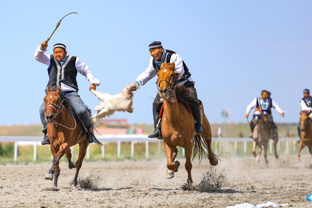 7月19日,演員們在新疆昭蘇舉行的2025新疆伊犁天馬文化旅游節開幕式上進行“叼羊”表演。當日,2025新疆伊犁天馬文化旅游節在昭蘇縣天馬文化園啟幕,馬術表演、民族傳統體育賽事與民俗藝術展演等活動精彩紛呈。新華社記者 王菲 攝