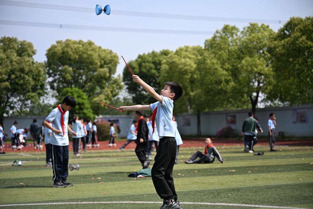 ↑4月23日,浙江省嘉興市秀洲區磻溪教育集團桃園小學的學生在操場上抖空竹。新華社記者 劉銘翔 攝