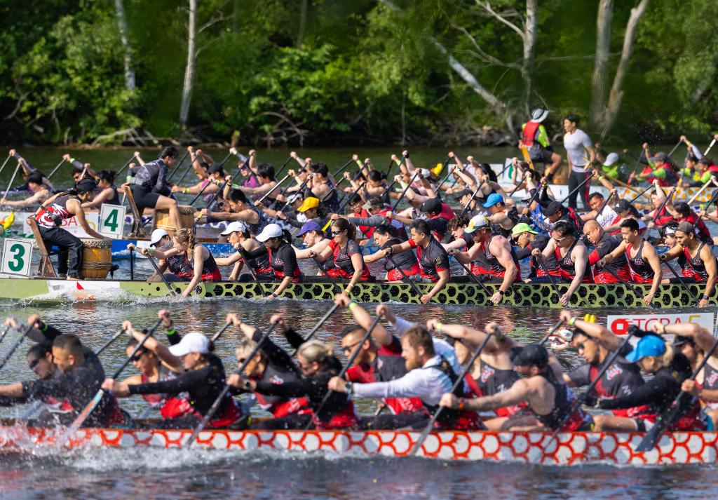 ↑6月14日,參賽者在龍舟節上競渡。當地時間6月14日至15日,加拿大多倫多舉辦2025年國際龍舟節。新華社發(鄒崢攝)