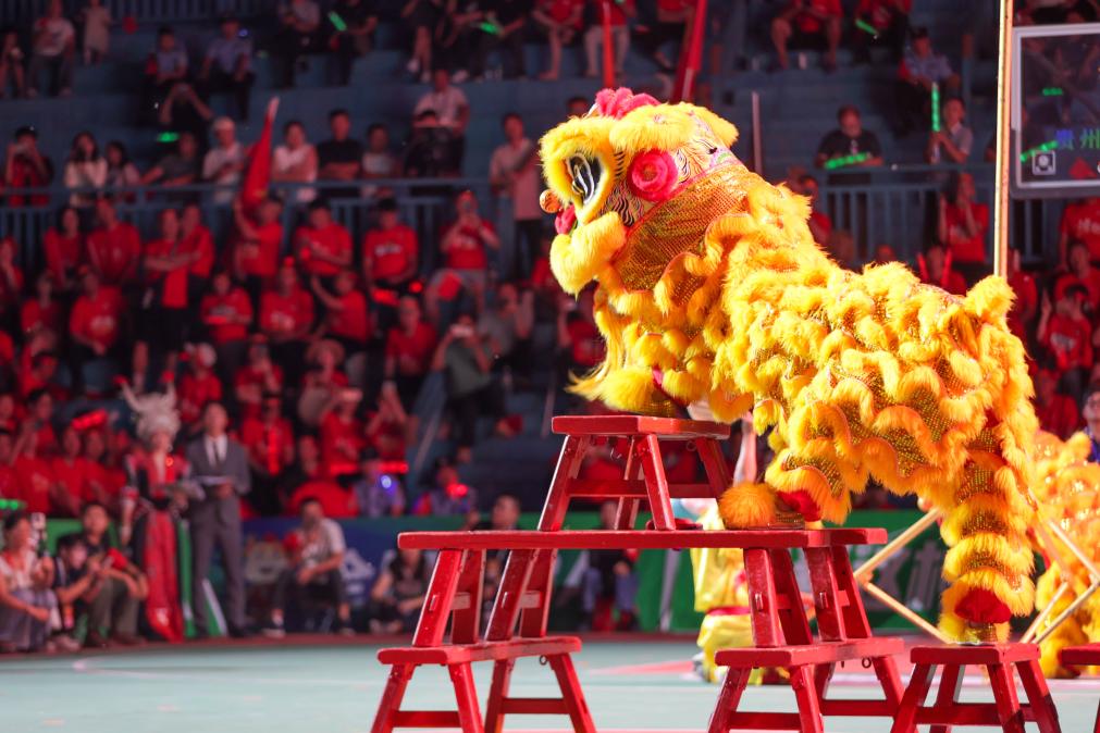 ↑11月11日,粵港澳聯隊在第十五屆全國運動會群眾展演舞龍舞獅南獅自選項目決賽中獲得一等獎。 新華社記者 王鵬 攝