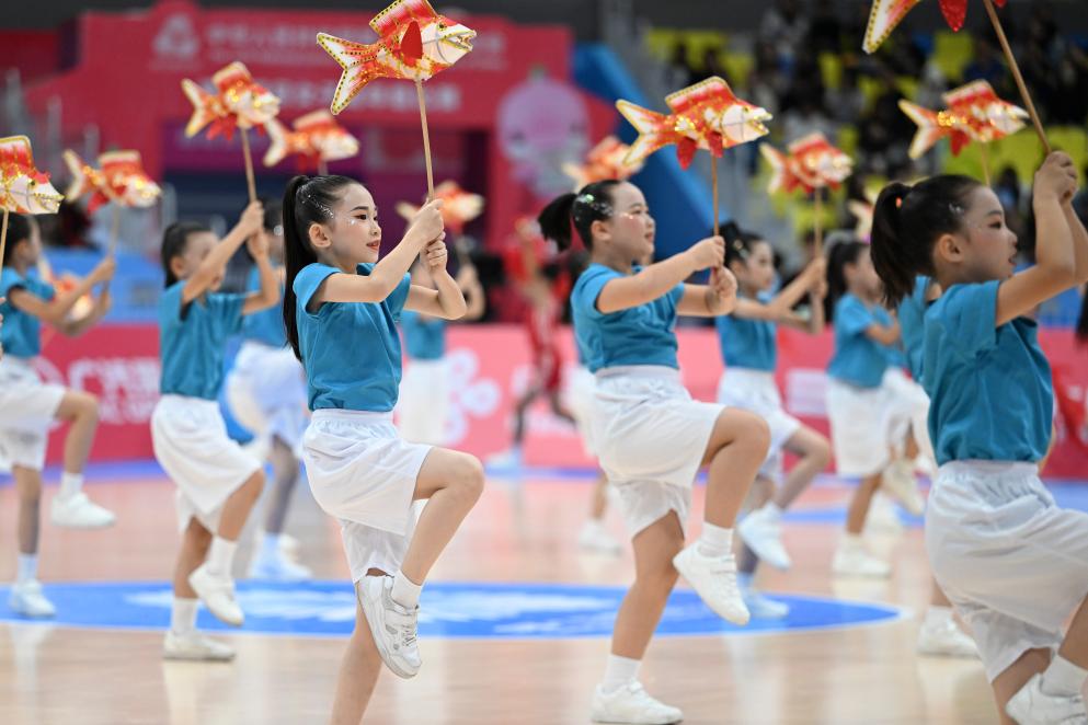 ↑11月15日,小朋友在第十五屆全國運動會籃球女子成年組銅牌賽中場休息期間表演。新華社記者 鄒競一 攝