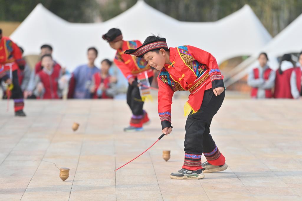 ↑2月20日,在廣西梧州市長洲區倒水鎮富萬村金桂廣場,富萬小學的學生在打陀螺。 新華社記者 黃孝邦 攝