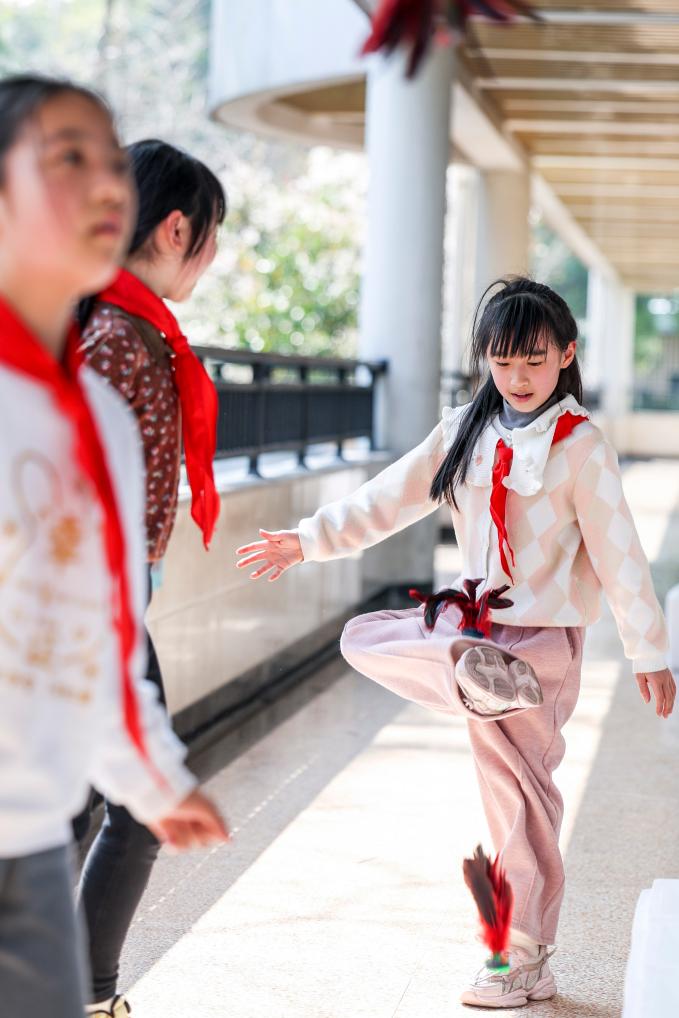 ↑3月11日,浙江省杭州市京都小學學生課間在走廊上踢毽子。新華社記者 江漢 攝